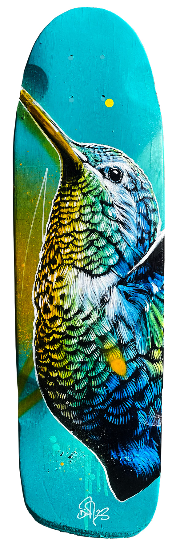 ACRYLIQUE, BOMBE ET ENCRE SUR PLANCHE DE SKATE.